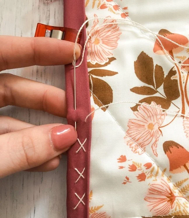 IMPORTANT: It is not noted in each step below, but every time you bring the needle down, grab a little bit of the backing fabric to attach it to the binding. This will make sure your stitches are secure.