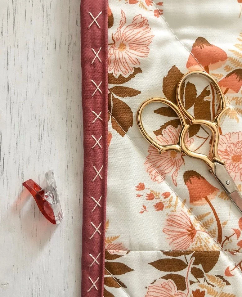 Now, let’s be honest, sewing the binding onto your quilt top is no one’s favorite part of making a quilt. But those final hand stitching steps are quickly being becoming mine. And here’s why: decorative big stitches that add such pretty and satisfying detail to a project. My favorite style so far has been the criss-cross stitch that I am explaining step by step below.