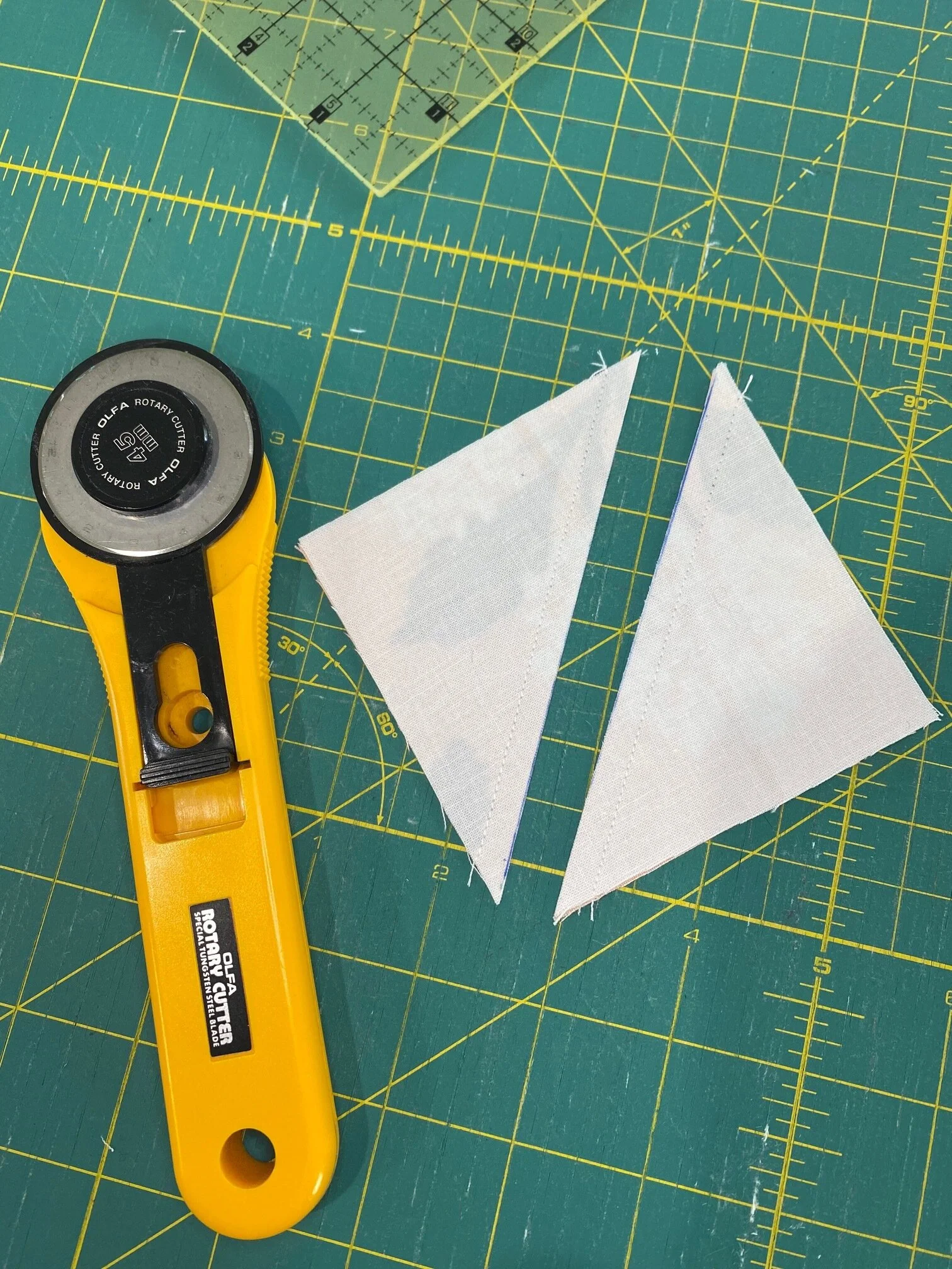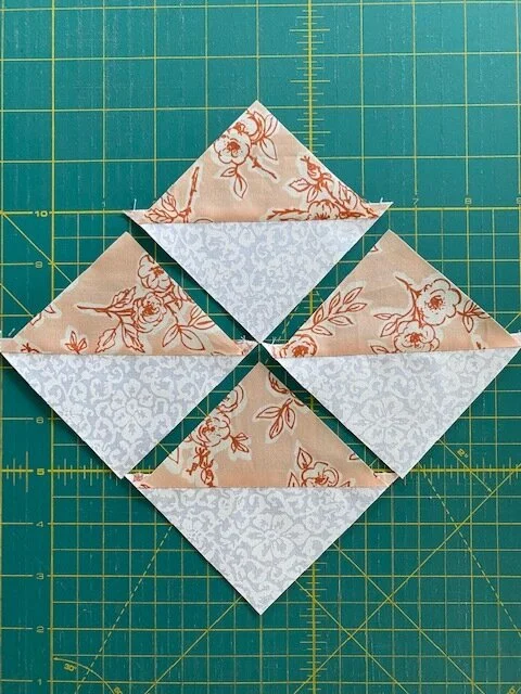 *this way causes your HST to be cut along the bias and therefore are prone to stretch. Make sure to starch well to help keep their shape.
