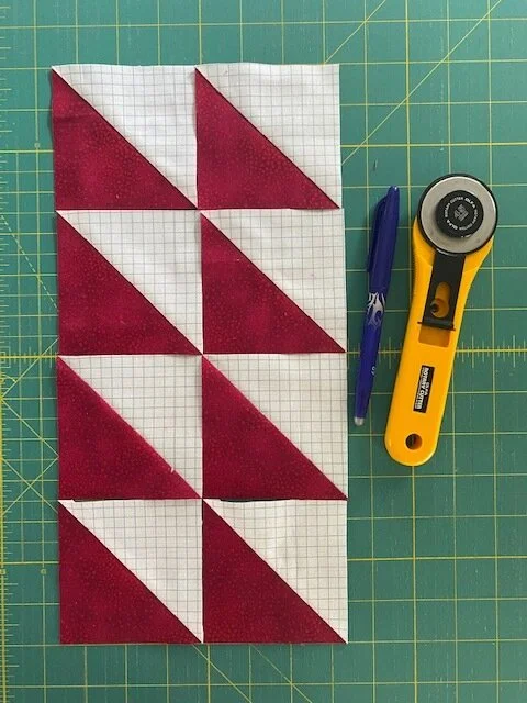 Cut 2 8” squares. Draw 2 diagonal lines across the back of one square. Sew 1/4” on either side of both lines. Cut along the drawn lines and down the vertical and horizontal mid lines of the squares. This will give you 8 HSTs that you can trim to be 3.5”