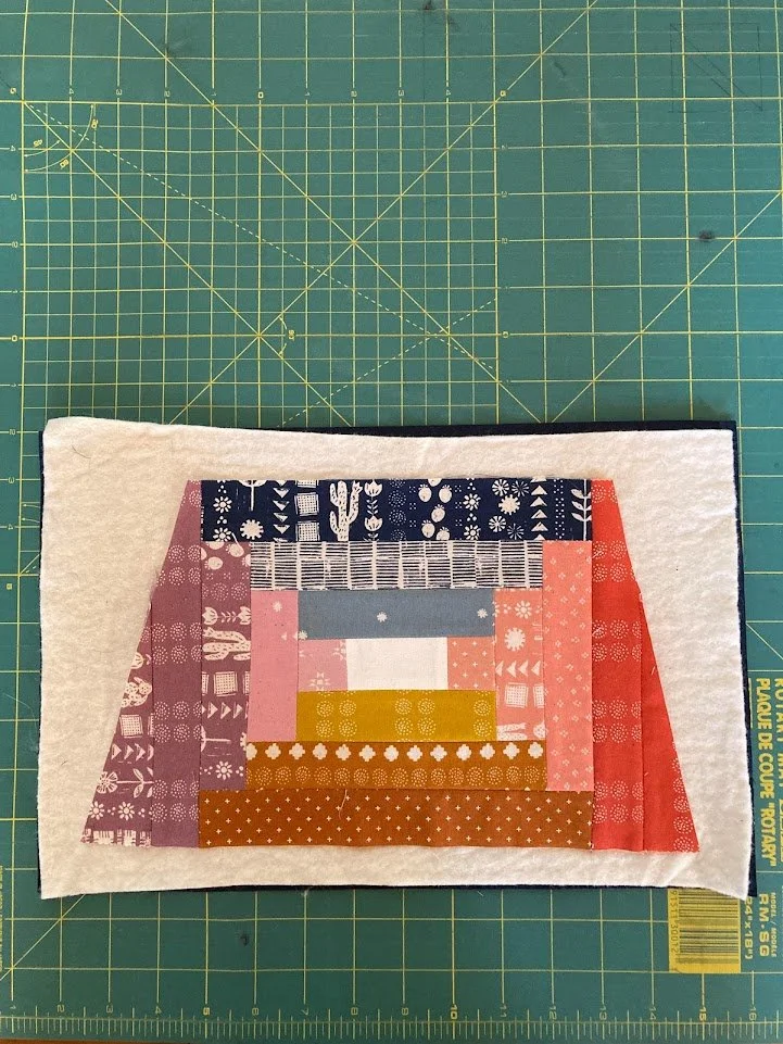 Compared to a typical quilt block, your quilted pocket is quite a bit smaller. You can save yourself some frustration by choosing a simple block to piece! I've made pockets with flying geese (easiest), courthouse steps (moderate), and the sawtooth star (more challenging).