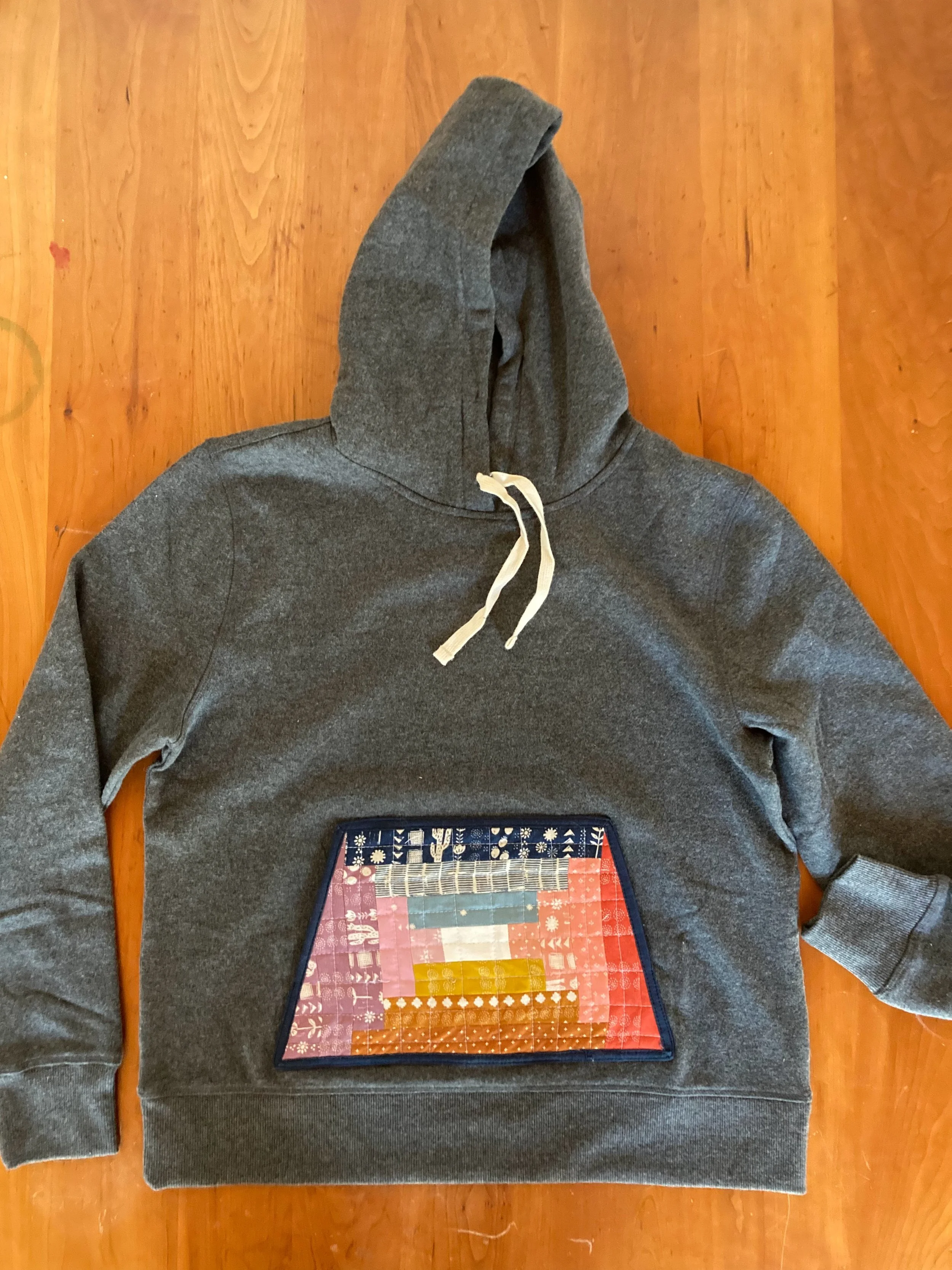 My first quilted pocket was an update to the kangaroo pouch on a hooded sweatshirt. A hoodie pocket isn't a rectangle so having a "template" to work from was invaluable.
